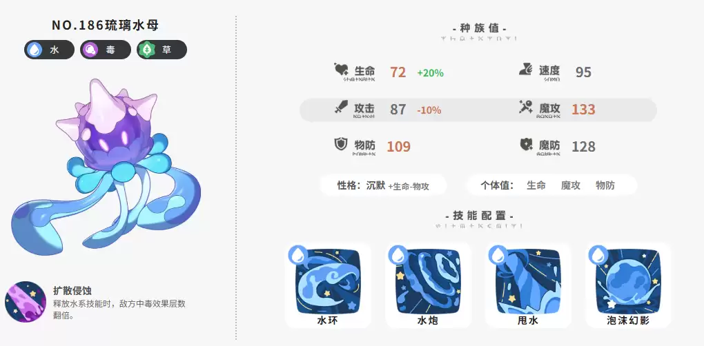 种族值:生命72(+20%)、速度95、攻击87(-10%)、魔攻133、物防109、魔防128