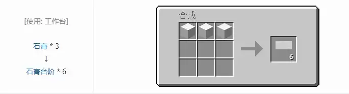 注意看合成网格的排列方式——石膏台阶的制造遵循着游戏内阶梯类方块的标准合成逻辑,只需按特定顺序摆放材料,就能批量制作出规整的阶梯构件。这种标准化设计既保持了合成系统的统一性,又确保了建筑组件的精准度。