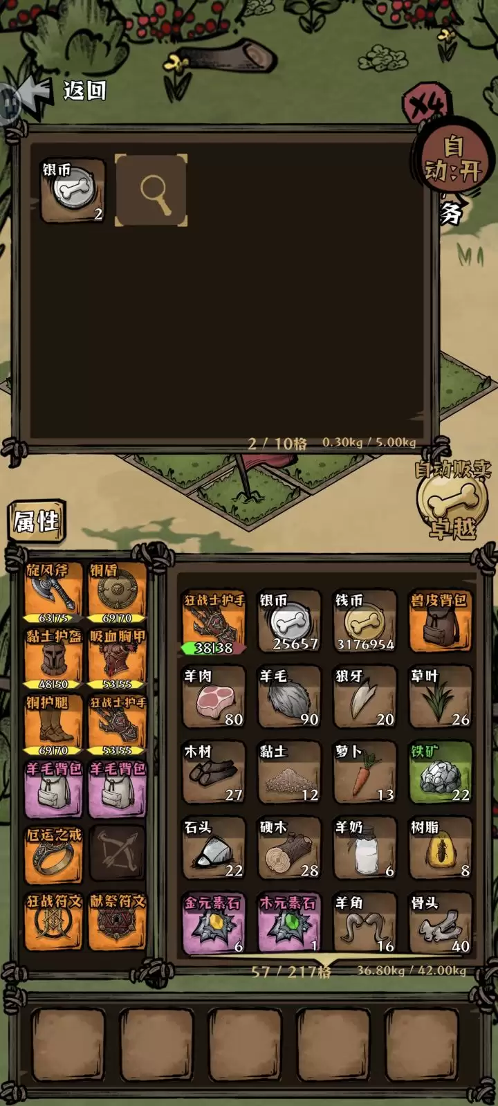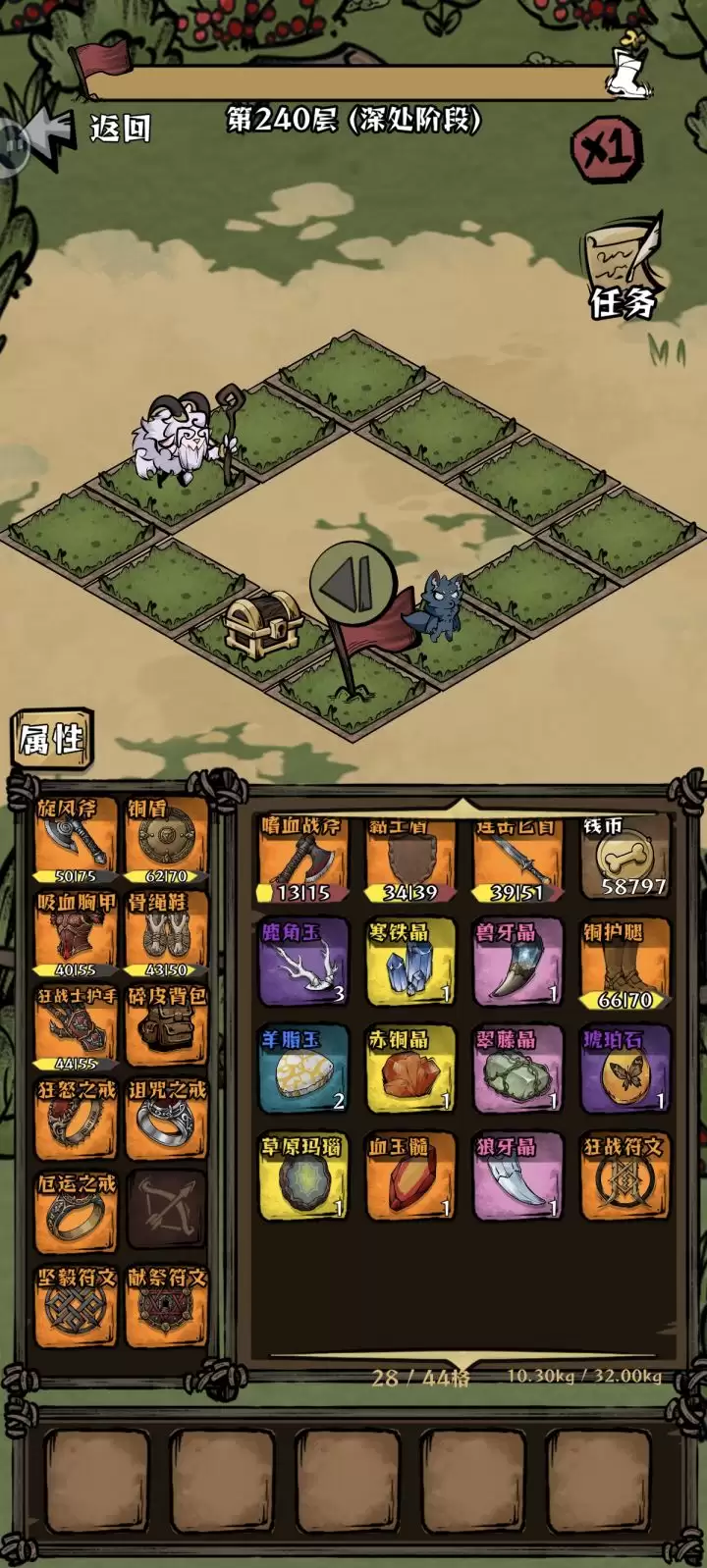 此阶段优先级应为:攻击>背包容量>幸运/暴击/爆伤。推进至羊村山脚时,在中段区域可着重刷取狂怒戒指(每回合按百分比提升攻击),深处区域则目标锁定坚毅符文(攻击转防御)。提示:绿色与紫色装备均能作为有效过渡,无需过早强求传说品质。