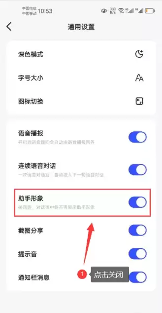 点击关闭助手形象功能开关【截图中圈红的部分】