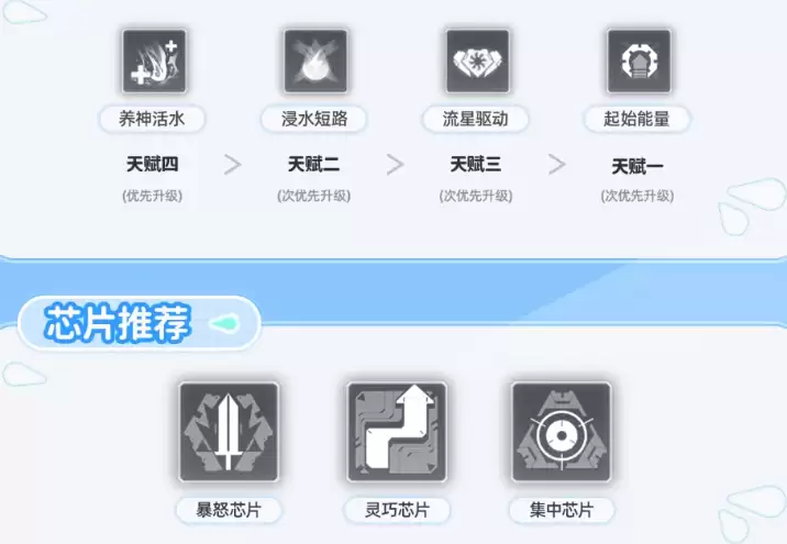 在技能升级这块,优先升级她的三技能,其次是二技能,最后才是1技能,这样的顺序优先级,让这个角色操控起来更加顺手,使用效率也会更高,优先升级天赋4,然后是天赋2;芯片比较适合“暴怒芯片”,“灵巧芯片”,“集中芯片”。