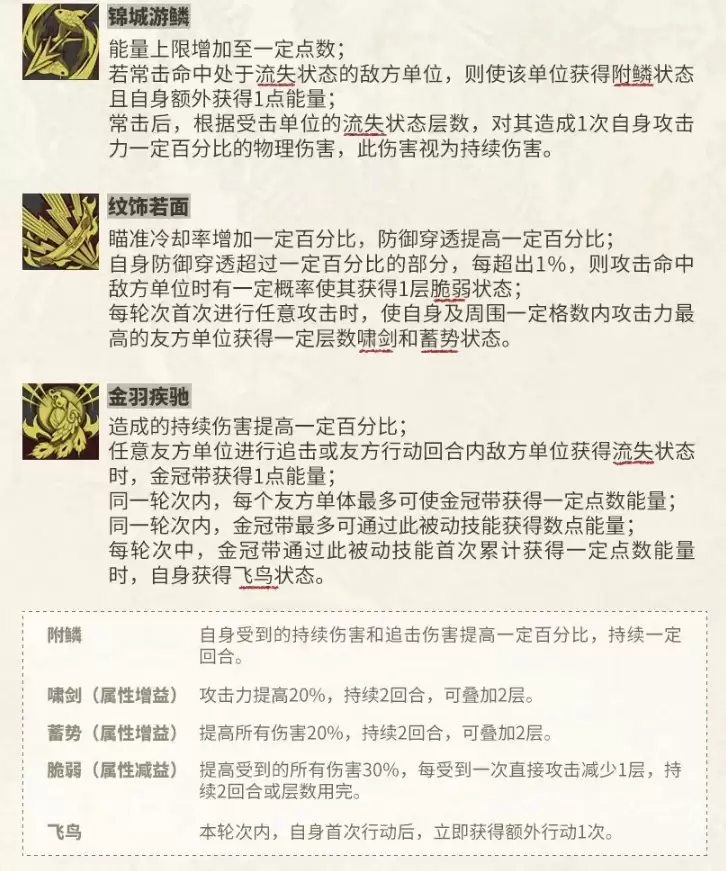 被动技能体系是金冠带战斗逻辑的基石。它精确规定了能量的获取途径、层数叠加规则以及各强化状态的触发阈值。深入掌握这部分,才能精准预判其爆发周期,实现节奏最优解。