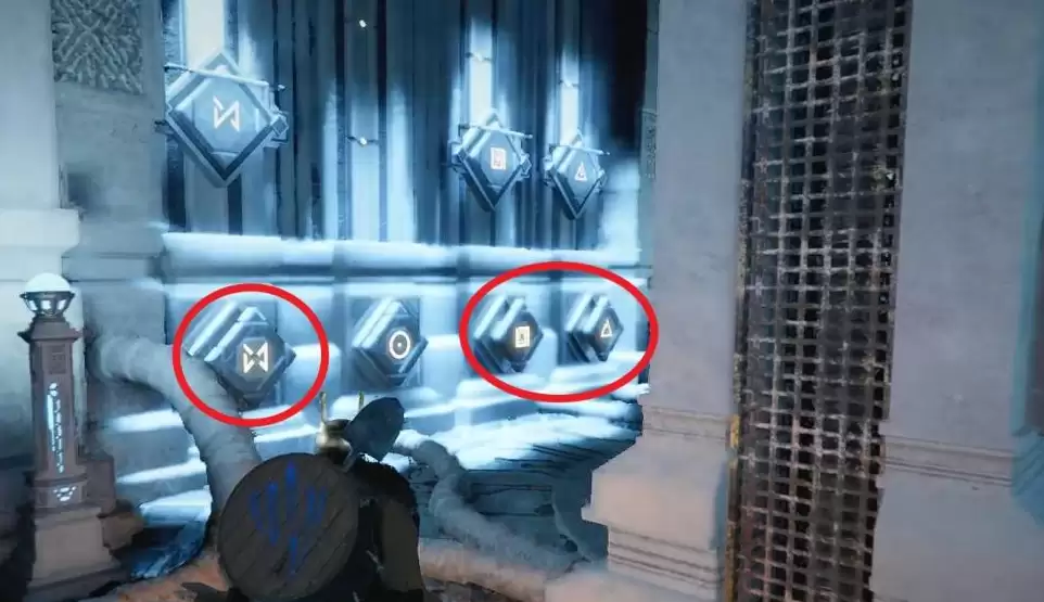 携带石符回到中央的谜题区域。注意地面上的发光凹槽,将获得的三块石符,依次插入图中红圈标注的三个对应板块位置。
