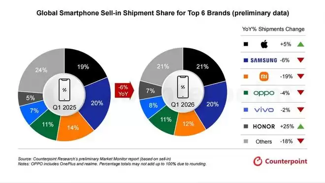 2026年Q1全球智能手机出货量同比下滑6%,荣耀与苹果逆市突围