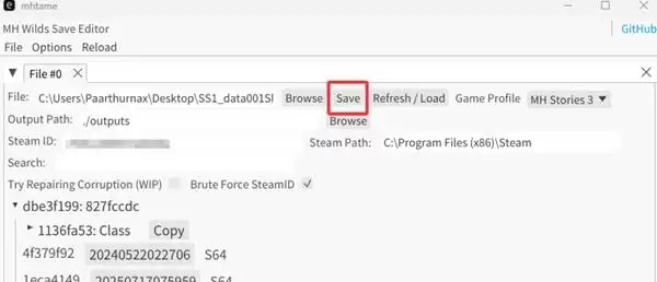 核心操作:将这串生成的ID代码替换为你个人账户的Steam ID,随后点击“Save”按钮保存修改: