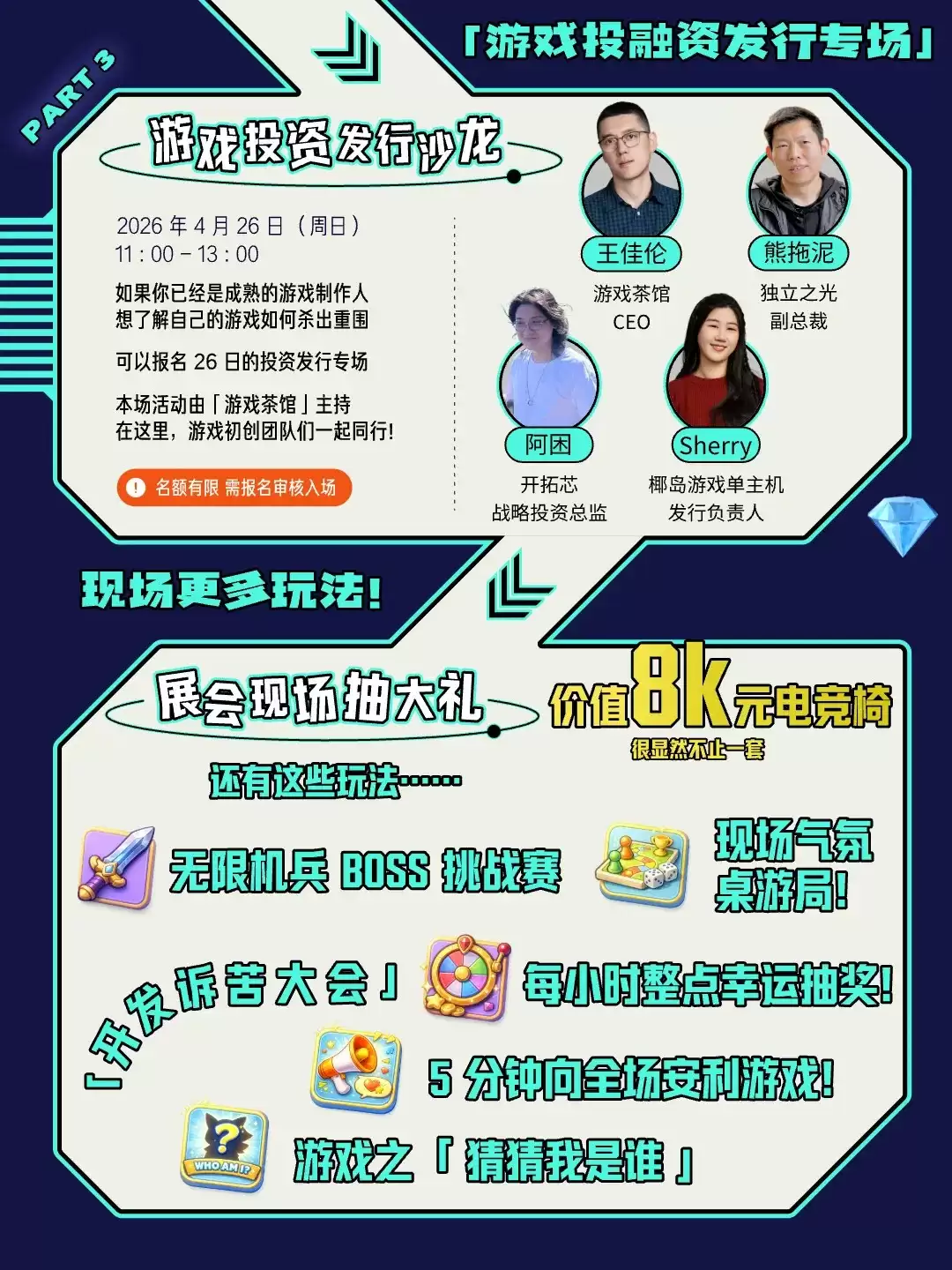 对于寻求发展的游戏开发团队,本次活动特设由@游戏茶馆 主办的投融资路演专场。其目标精准:高效链接优质项目与资本,直击游戏团队融资痛点。