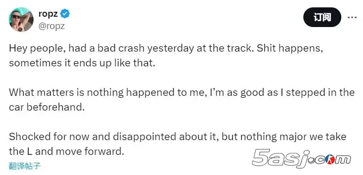 CS2明星选手ropz赛道惊魂!严重撞车后报平安:'接受失败,重新出发