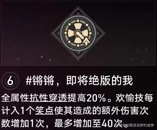 4魂:施放终结技获得笑点,并提高欢愉度。笑点和欢愉度都能直接放大欢愉伤害,属于扎实的伤害提升命座。