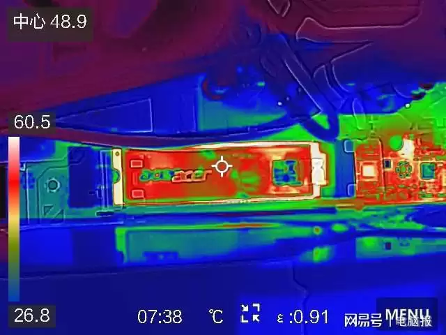 除了强劲性能,宏碁ACER N8000的核心优势在于其出色的能效与温控。搭载的6nm低功耗主控,结合覆盖核心元件的石墨烯散热贴,共同构建了高效的散热体系。我们通过CrystalDiskMark进行满载压力测试,并分别记录安装与不安装散热片时的温度数据。