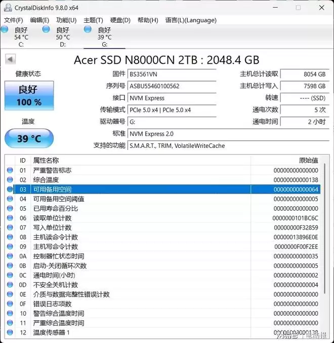 安装至测试平台并完成分区格式化后,系统显示SSD可用容量为1.86TB。通过CrystalDiskInfo可完整识别宏碁ACER N8000的所有参数。在25℃室温环境下,其待机温度仅为39℃,表现出优秀的低功耗待机特性。