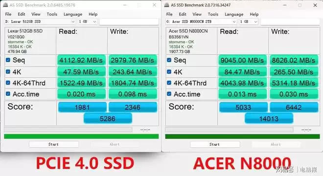 为直观对比性能代差,我们将其与PCIe 4.0系统盘进行对比。AS SSD Benchmark测试显示,ACER N8000的连续读取速度为9045MB/s,连续写入速度为8626MB/s,4K-64Thrd多线程随机读写则保持在4043.98MB/s和5314.18MB/s,综合得分高达14013分。相比PCIe 4.0 SSD,其顺序读写性能领先约115%,随机读写性能领先幅度更达到178%,代际优势显著。