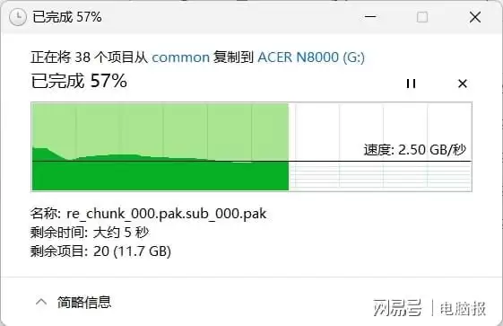 在实际文件拷贝测试中,我们分别模拟了大文件与小文件群的应用场景。拷贝一个25GB的单体电影文件耗时7.8秒,平均写入速度3.2GB/s;拷贝一个包含2000个小文件、总容量27GB的游戏客户端,耗时10.3秒,平均写入速度2.6GB/s。尽管受限于PCIe 4.0拷贝盘的性能瓶颈,未能完全发挥ACER N8000的峰值带宽,但其表现已能确保日常文件操作极致流畅。