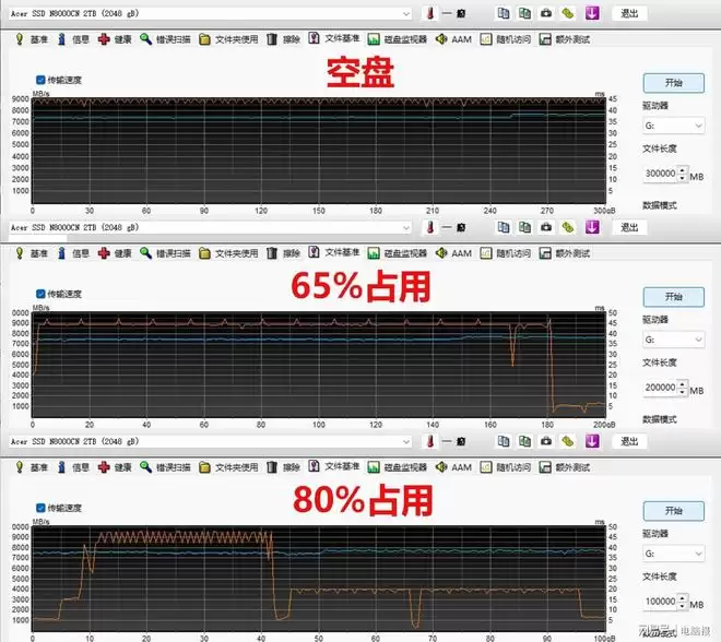 宏碁ACER N8000采用的HMB+SLC Cache智能缓存技术是其高性能的保障。通过HD Tune文件基准测试其缓存策略:空盘状态下,SLC缓存容量超过300GB;在占用65%时,缓存容量约为180GB;即使占用率达到80%,连续写入超过40GB后速度仍能维持在4000MB/s左右,直至写入超过90GB才会完全超出缓存范围。这表明即使在接近满盘状态下,其缓存容量也足以应对日常大文件传输,用户无需担心性能骤降。