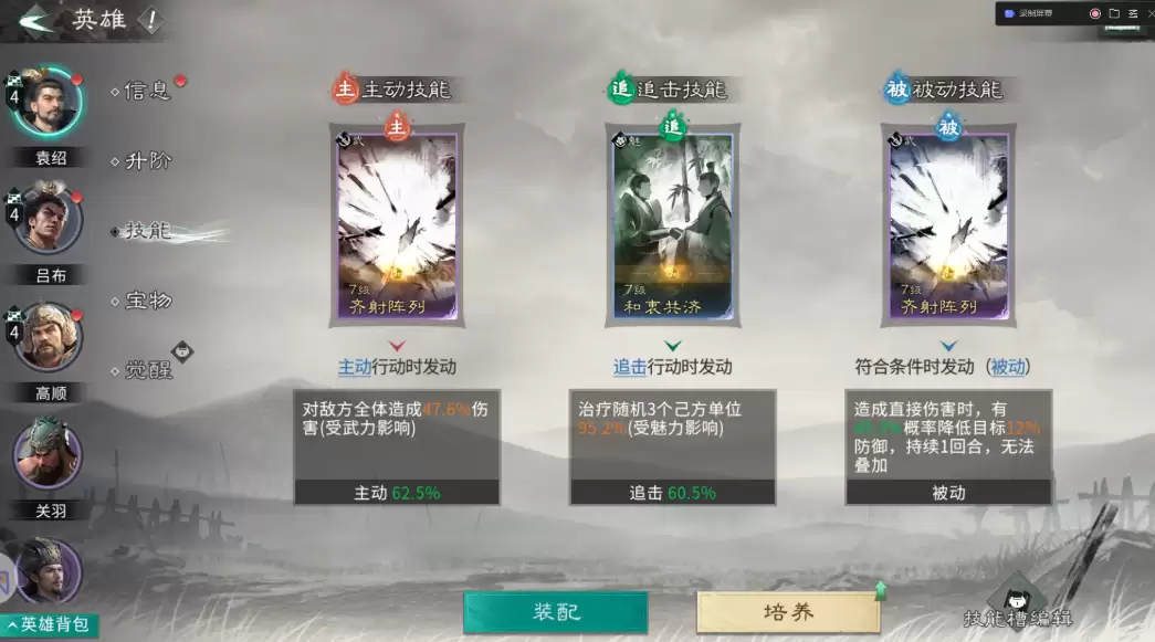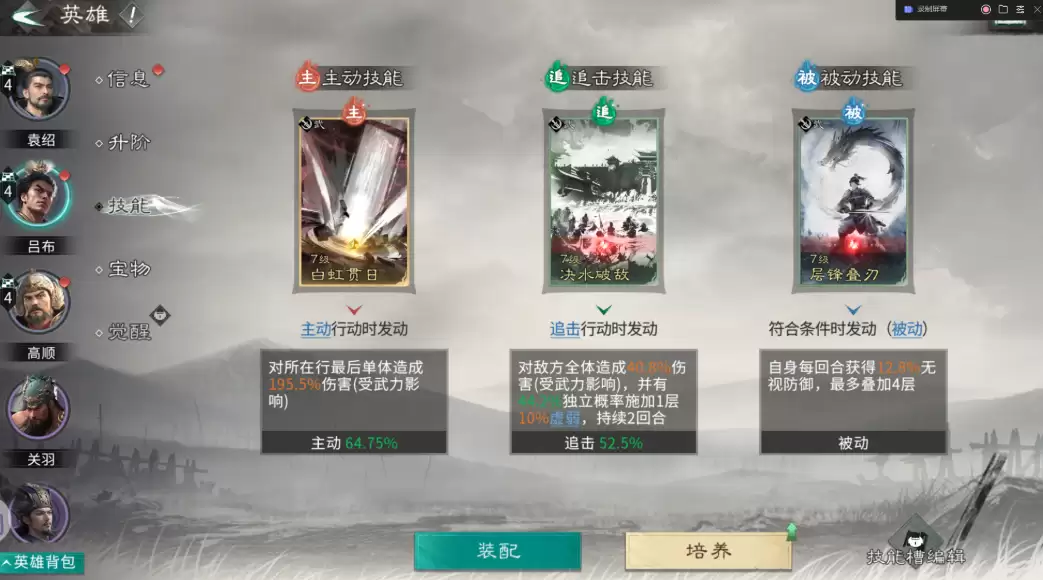 技能搭配需要严格遵循战术逻辑。高顺的被动技能首选“一夫当关”,牺牲输出换取极致防御,确保其站场能力;主动技能“首尾相援”提供的治疗与减伤效果,能进一步巩固前排防线。吕布的主动技能固定选择“白虹贯日”,专门针对敌方后排脆弱单位;追击技能“决水破敌”附带的虚弱状态能有效压制敌军血量;被动技能“层锋叠刃”则通过叠加破防效果,实现越战越强的输出成长。袁绍的技能组合以“齐射阵列”为核心,兼顾压血线与破防双重功能,配合“和衷共济”的团队治疗,使他成为名副其实的辅助多面手。
