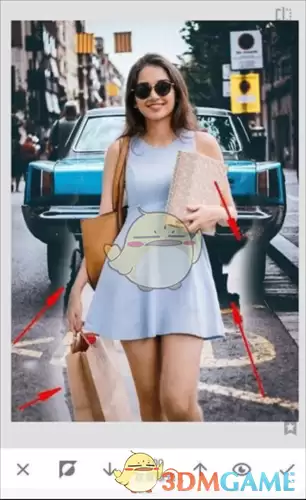 接下来是精细活儿:处理人物边缘。我们都知道要用双指放大图片来涂,但像手指缝、发丝这种细微处(如下图6),即使放到最大,画笔笔头可能还是显得太粗,容易涂到背景上。