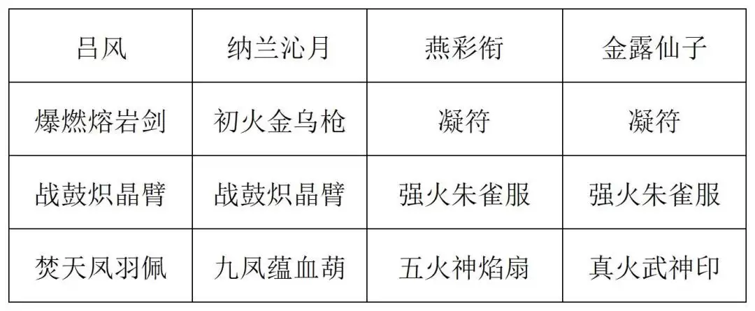 纳兰沁月打百战心法,燕彩衔打焚元蓄威术、战意诀和焚元蓄力诀,金露仙子接焚元蓄力诀和焚灵诀,燕彩衔打出五火神焰,吕风复制五火神焰并全部打出,最后纳兰沁月打诛仙战意诀和诛仙业火诀。