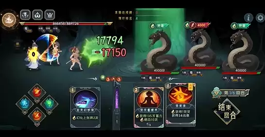 林瑶先手打出燎原诀和涅槃咒,这里要特别注意系统赠送的1费祝福卡,别让灵气被卡住。接着金露仙子打出焚灵诀和焚元蓄力诀,燕彩衔跟上焚元蓄威术、焚元蓄力诀和战意诀。然后金露仙子打出无相衍火咒,林瑶补上战意诀,吕风复制火之圣福并全部打出,但要记得保留火之赐福。