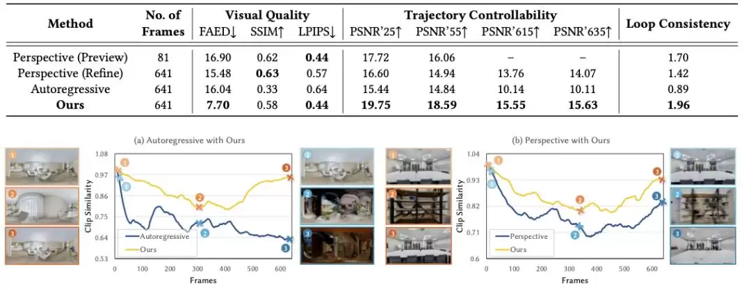 深入分析表明,全景表示与两阶段生成设计是性能提升的关键,使模型在生成长视频时保持稳定可控。文章对比了在长视频(641帧)条件下,包括自回归生成与基于透视表示方法在内的不同方案表现。