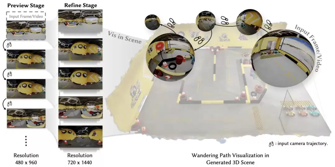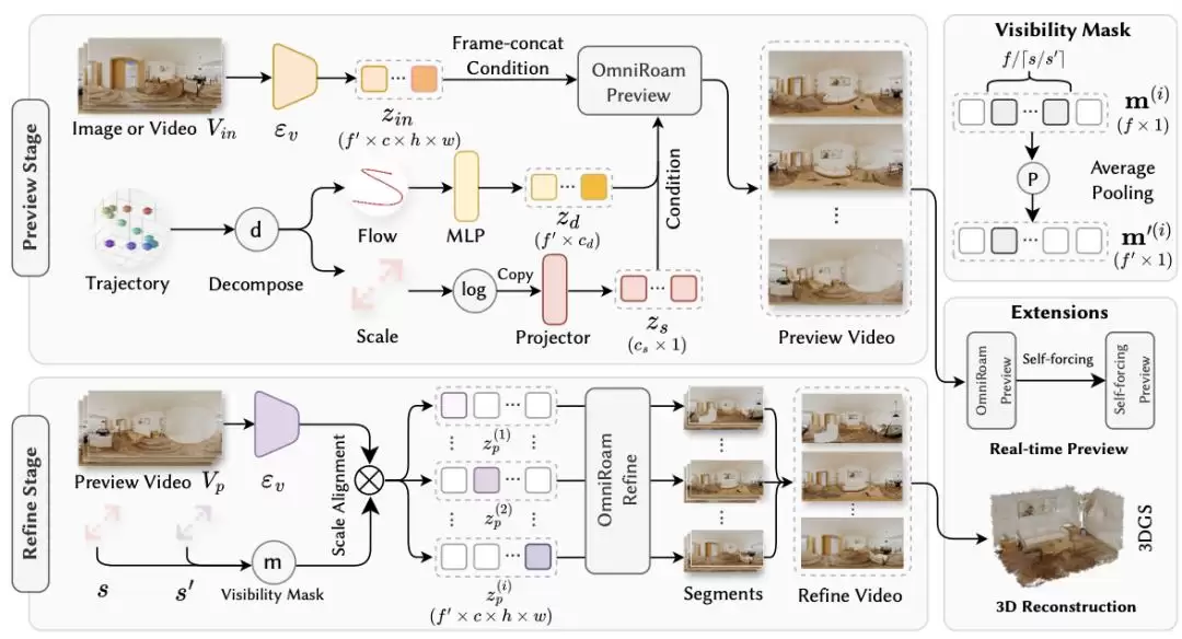 OmniRoam首先生成一个中等分辨率的全景视频预览。这类似于施工前的设计蓝图,旨在确立整体的运动路径与场景布局。