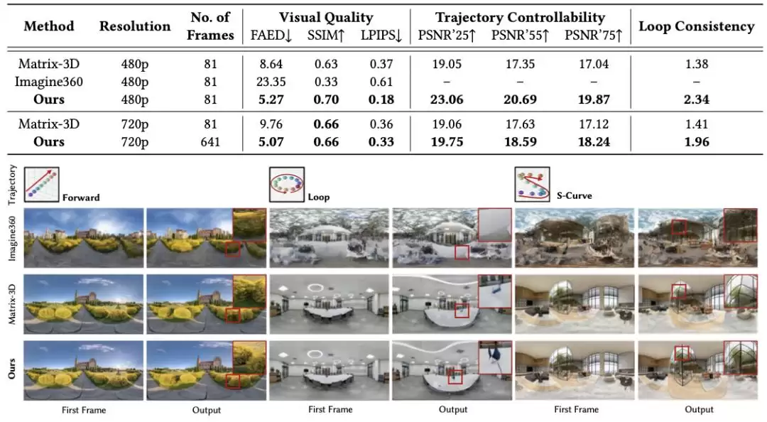 数据采用“虚实结合”策略:真实全景视频提供场景多样性,合成数据则提供精确轨迹监督。通过路径规划算法确保所有运动轨迹合理。评测方面,团队提出了闭环一致性指标:要求模型沿闭环路径生成视频,在返回起点时需保持中间过程的合理变化。该指标能更有效地衡量长时序下的空间一致性。