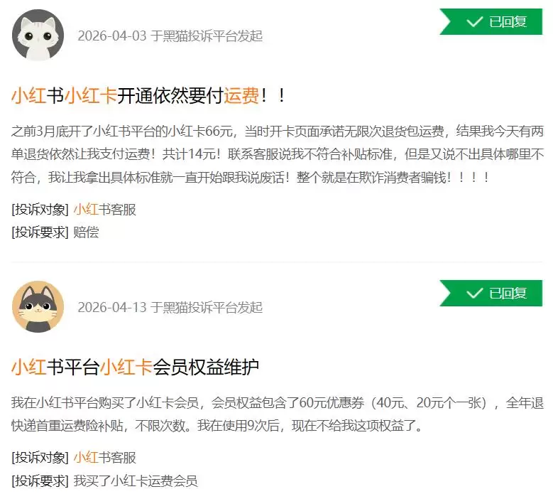 但理想蓝图与落地现实之间,仍存在显著差距。已有用户在开通新版小红卡后,于黑猫投诉平台反馈,开卡页面承诺的“无限次退货包运费”,在实际操作中仍被要求支付部分运费,且客服无法提供清晰的补贴标准与规则。