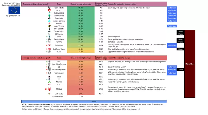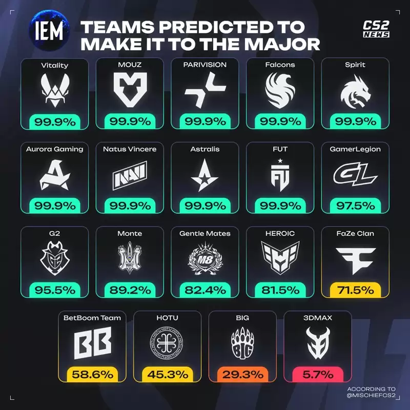 根据VRS爱好者与统计媒体MischiefCS2发布的最新数据模型,IEM科隆Major欧洲赛区的晋级形势已得到更新。核心洞察显示:全球排名前十的战队锁定科隆Major席位几无悬念。当前的核心悬念,已转变为这些强队将直接获得正赛资格,还是需要从更早的入围阶段开始征战。