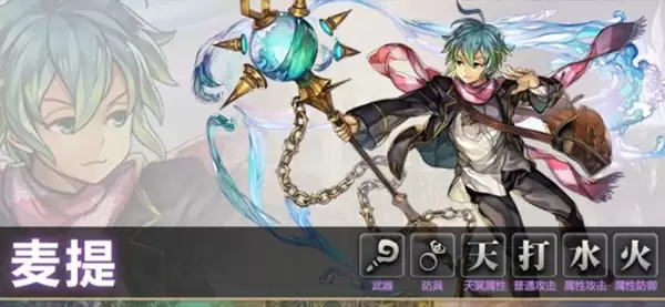 第六名:麦提。 水属性法师的代表。他的技能组非常实用,涵盖了攻防两端:50%的火属性盾能有效针对火系敌人,单体控场和降速可以打乱对手节奏,还有强力的全体水魔法用于清场。可以说,麦提是一个功能比较全面的法系输出手,在面对火属性敌人时尤其有奇效。