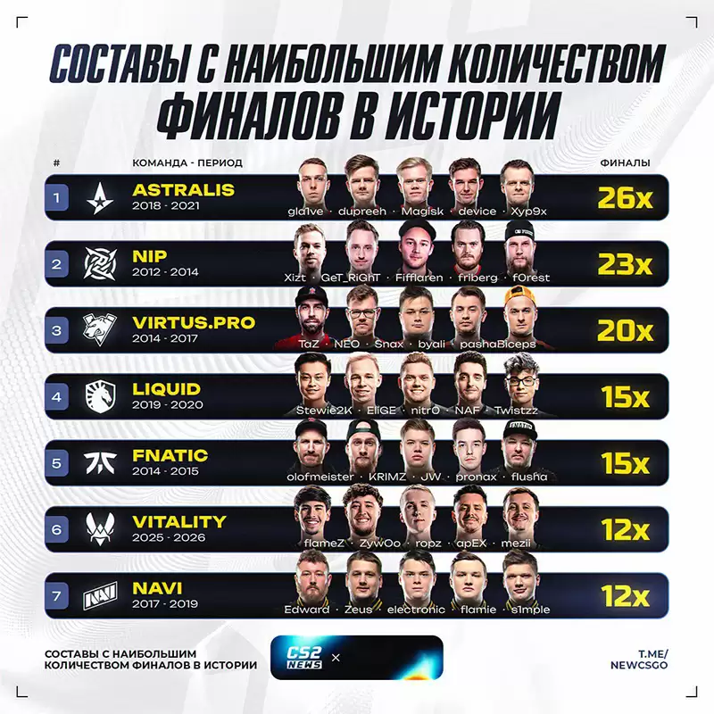 这一成就的历史分量如何?根据外媒最新统计的历史数据,Vitality当前阵容的决赛晋级次数已成功进入历史榜单前七名。下图直观展示了他们的排名位置。
