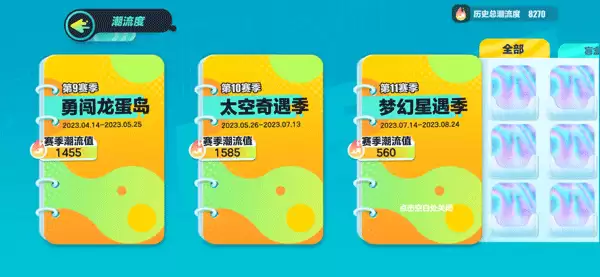 除了总的家族,游戏还贴心地把潮流度按赛季做了划分。这就像一份你的“赛季时尚成绩单”,特别适合用来回顾在每个阶段自己的收集情况。