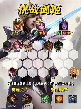 4、挑战剑姬——三星剑姬的杀伤力谁用谁知道,那种刀刀入肉的快感,简直是在挑战操作的极限。我个人认为这是当前版本最爽的阵容之一。
