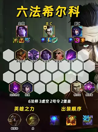 2、六法希尔科——这套阵容的回血能力简直离谱,我印象最深的是有局对面打了半天,我家前排血量纹丝不动,对手怕是在屏幕前怀疑人生了。