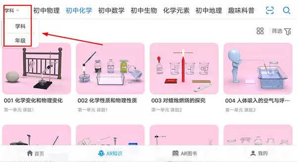 进入“AR知识”页面后,你会发现所有学习资源都在这儿了。但是,怎么快速找到自己需要的内容呢?秘诀就在页面右上方。点击那个“学科/年级”的筛选按钮。