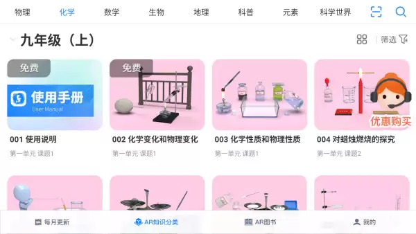 进入AR知识分类模块,你会发现这里简直就是个知识宝库。涵盖数学、物理、化学、地理、生物和科普等初中阶段核心学科,数百个知识点都以AR形式精心呈现,让抽象概念变得触手可及。