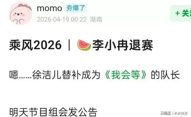 4月19日凌晨,一位IP地址显示为湖南的网友在社交平台发布爆料,称李小冉已退出比赛,其位置将由艺人徐洁儿接替,并担任《我会等》曲目组的队长。爆料者进一步声称,节目组将于后续正式公布这一人员调整。