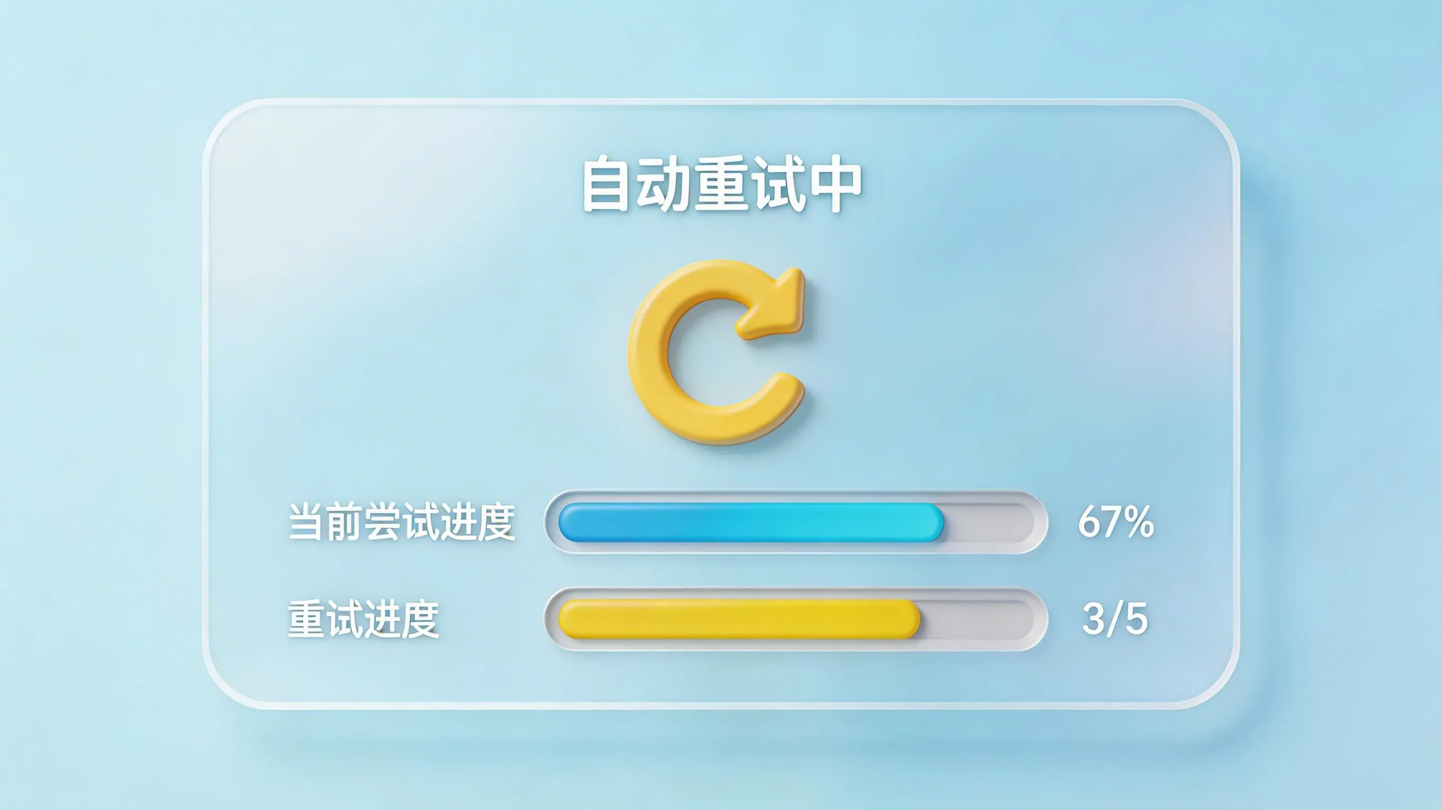 重试间隔: 强烈推荐采用“指数退避”策略。举个例子,第一次失败后等10秒重试,第二次等30秒,第三次拉到2分钟。这种逐步拉长时间的策略,能给目标系统留出充足的恢复时间,显得更“友好”。