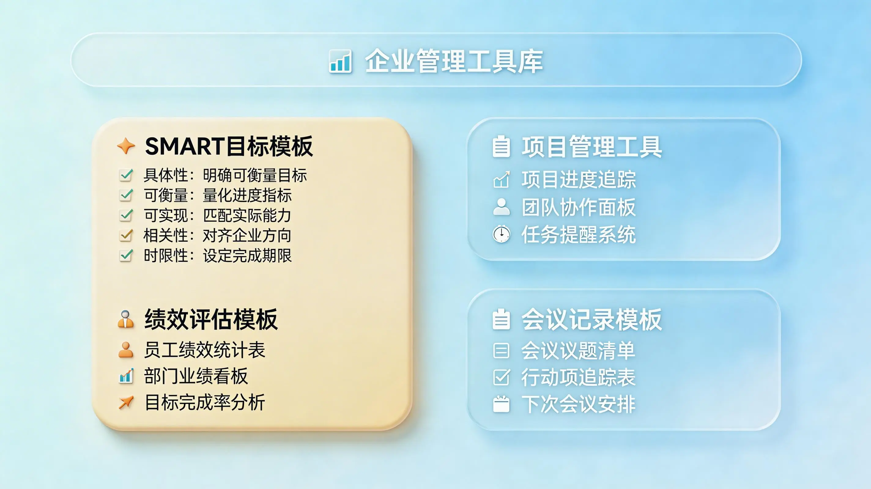 这是大多数执行者的核心诉求——跳过理论,直接应用。主流协同办公平台已提供了成熟的解决方案: