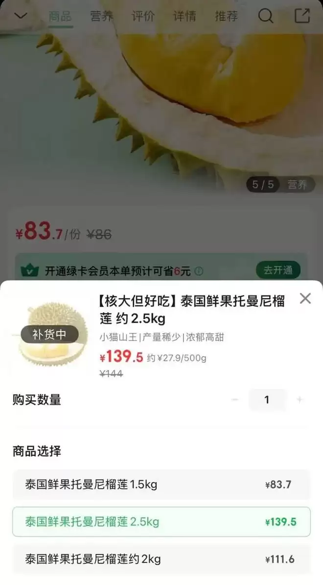 叮咚买菜APP上,泰国鲜果托曼尼榴莲售价约每斤27.9元,其中2kg和2.5kg规格同样显示“补货中”。