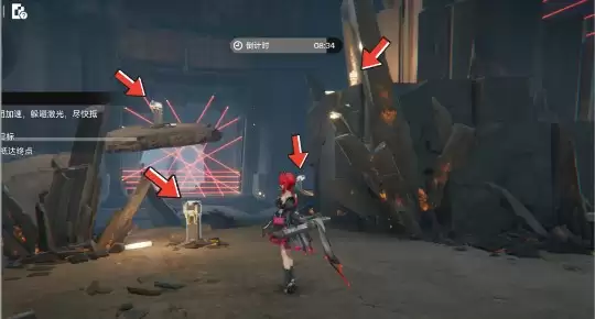 抵达终点前有个小机关:四组射线装置挡在路上。得先把这四个机关全部激活,让射线消失才能继续前进。