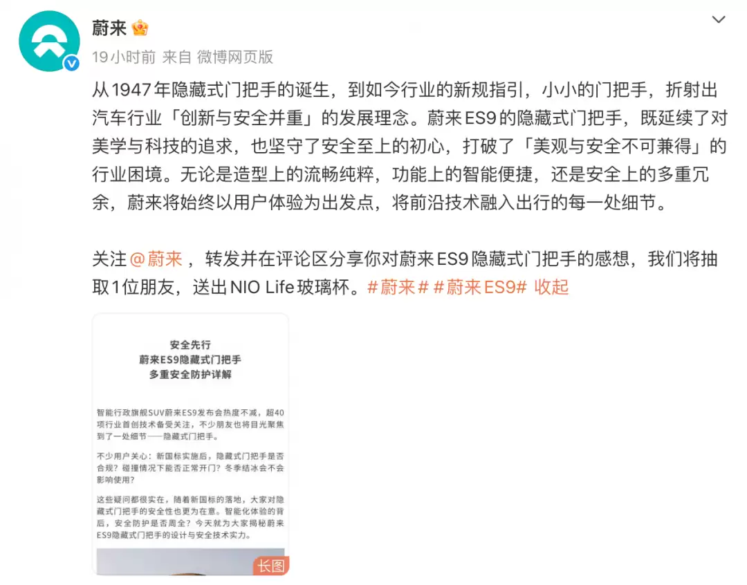 核心信息明确:蔚来当前全系在售车型,包括ES9,其隐藏式门把手均符合现行国家标准,功能正常,用户可放心使用。
