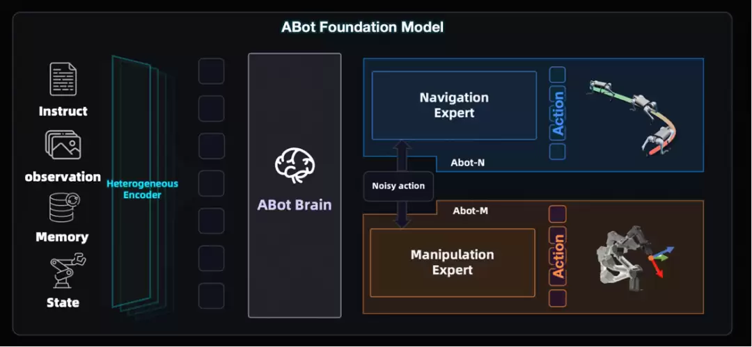 若将ABot全栈体系视为具身智能的“运行大脑”,那么ABot-N与ABot-M便是其“运动双核”。它们分别掌管机器人的“双腿”与“双手”,直接响应物理世界中“去哪里”与“做什么”的基础指令。依托统一架构设计,高德打造出了既可解耦又能协同的专用基座模型。
