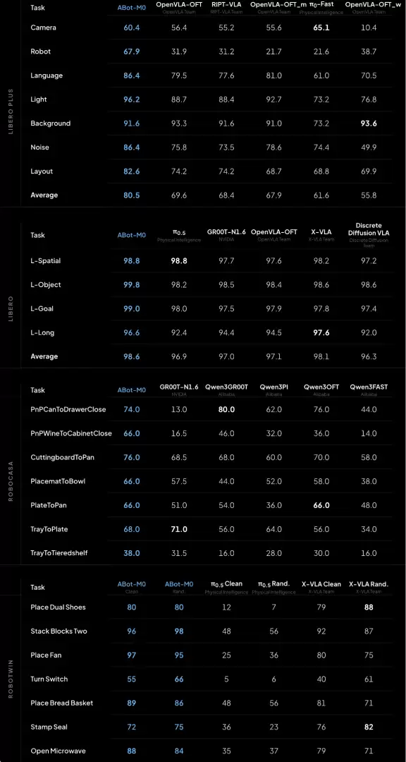 在LIBERO、LIBERO-Plus、RoboCasa GRRoboTwin 2.0等主流评测中,ABot-M全面超越了π0.5、UniVLA、OpenVLA-OFT等基线模型,在泛化能力、鲁棒性与跨形态迁移三个维度实现了系统性领先。