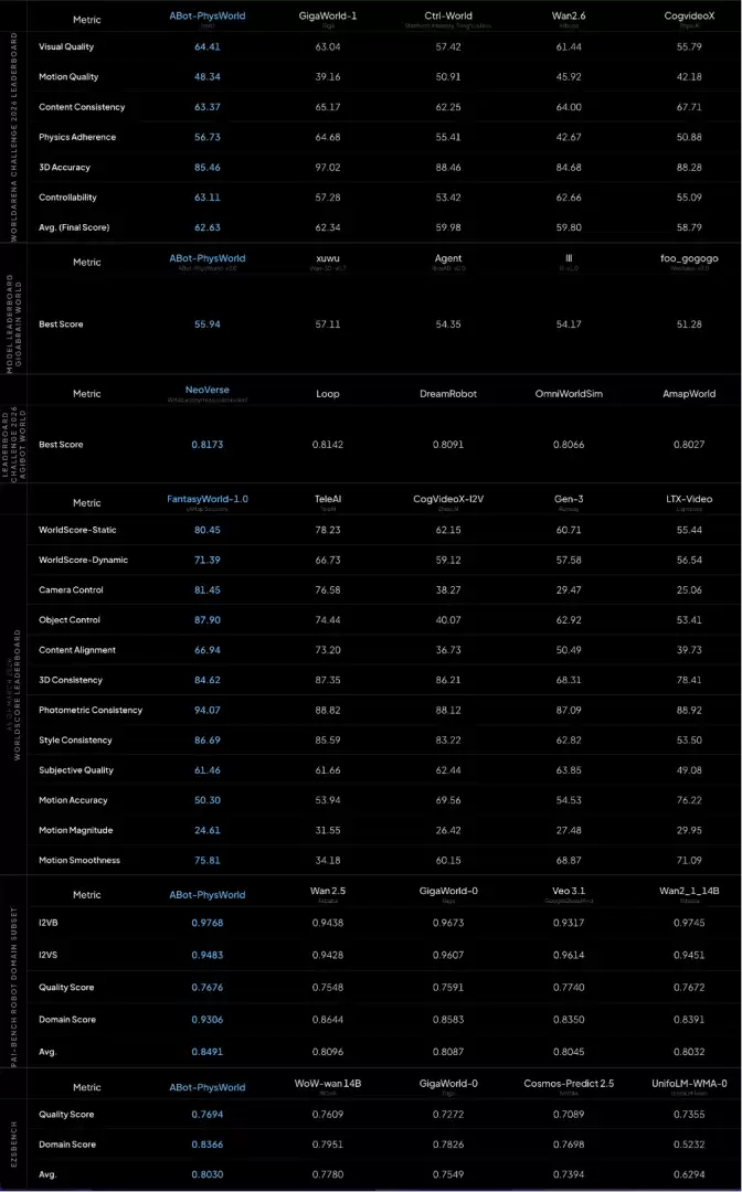 在PBench、EZSbench、WorldArena、Agibot World Challenge等主流评测中,ABot-World持续保持领先,并成为唯一在物理合规性、动作可控性、零样本泛化三大关键维度均达到SOTA水平的模型。