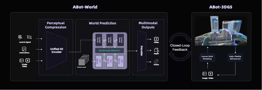 此外,ABot-World构建了“训练+数据”双引擎并行的架构,实现了模型的自进化。依托高德自有地图与脱敏数据,结合3DGS技术,系统已累计生产了上万级3D真实场景、百万级推理数据与千万级训练轨迹,覆盖了99%的典型生活场景。通过接入视觉语言-动作闭环,模型实现了“预测即训练,演练即学习”的持续进化能力。