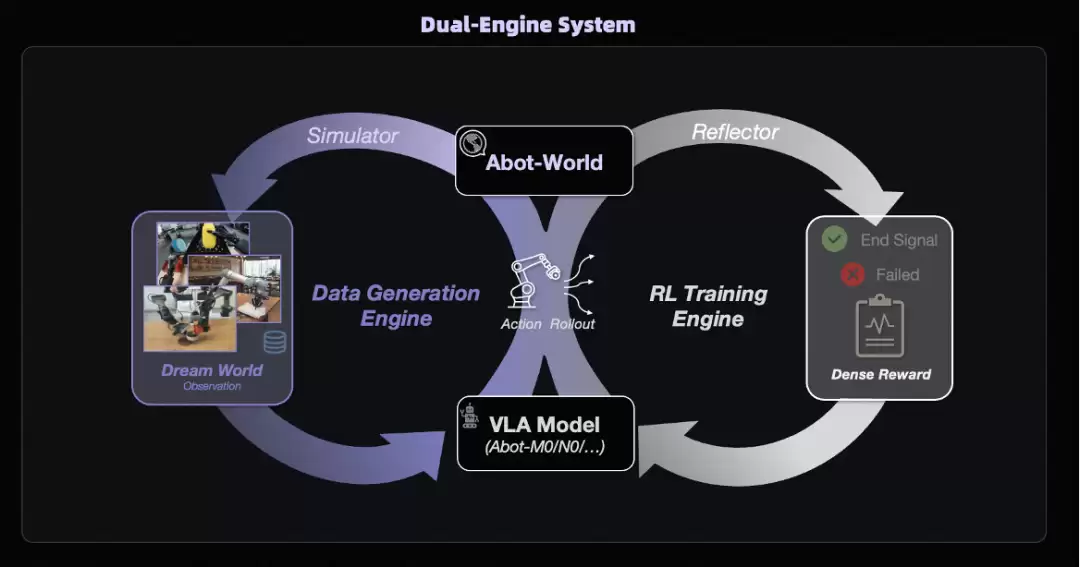 数据是决定具身智能泛化能力上限的关键。传统真机采集方式成本高昂,难以规模化。ABot-World作为数据层核心解决方案,通过批量合成视频、深度、点云、轨迹四类关键训练数据,并配合强化学习引擎在虚拟环境中进行训练。这套高保真仿真方案,有效弥合了“仿真到现实”的鸿沟,将数据成本降低了数个数量级。