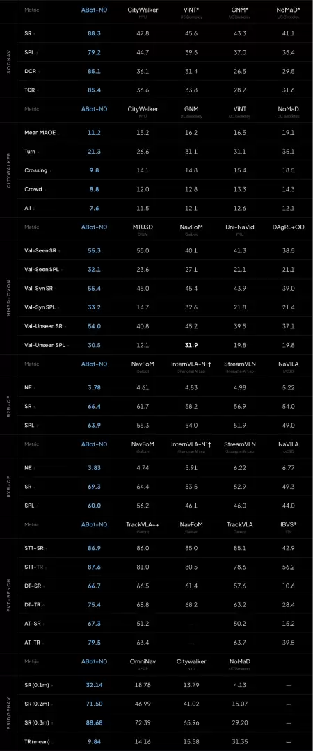 ABot-N推出后,迅速在VLN-CE(R2R/RxR)、HM3D-OVON、EVT-Bench等7大权威基准上全面刷新SOTA,并在导航精度、社会合规性、零样本泛化能力上实现了断层式领先。