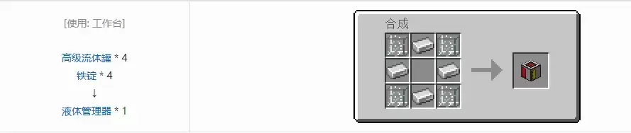 其实合成配方并不复杂,关键在于材料的摆放顺序。只要按照图示准确排列,很快就能获得属于你自己的液体管理器了。话说回来,这个装置在自动化流水线中可是不可或缺的核心组件呢。