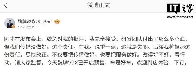 事件发酵后,魏牌CEO赵永坡在社交媒体迅速回应。其回应堪称标准动作:全盘接受批评,主动承担管理责任,并以“失职”进行定性。关键之处在于,他同步给出了明确的改进路径——优化传播策略、升级用户服务,并承诺接受公众检验。这种不回避、速整改的姿态,暂时控制了舆论态势。