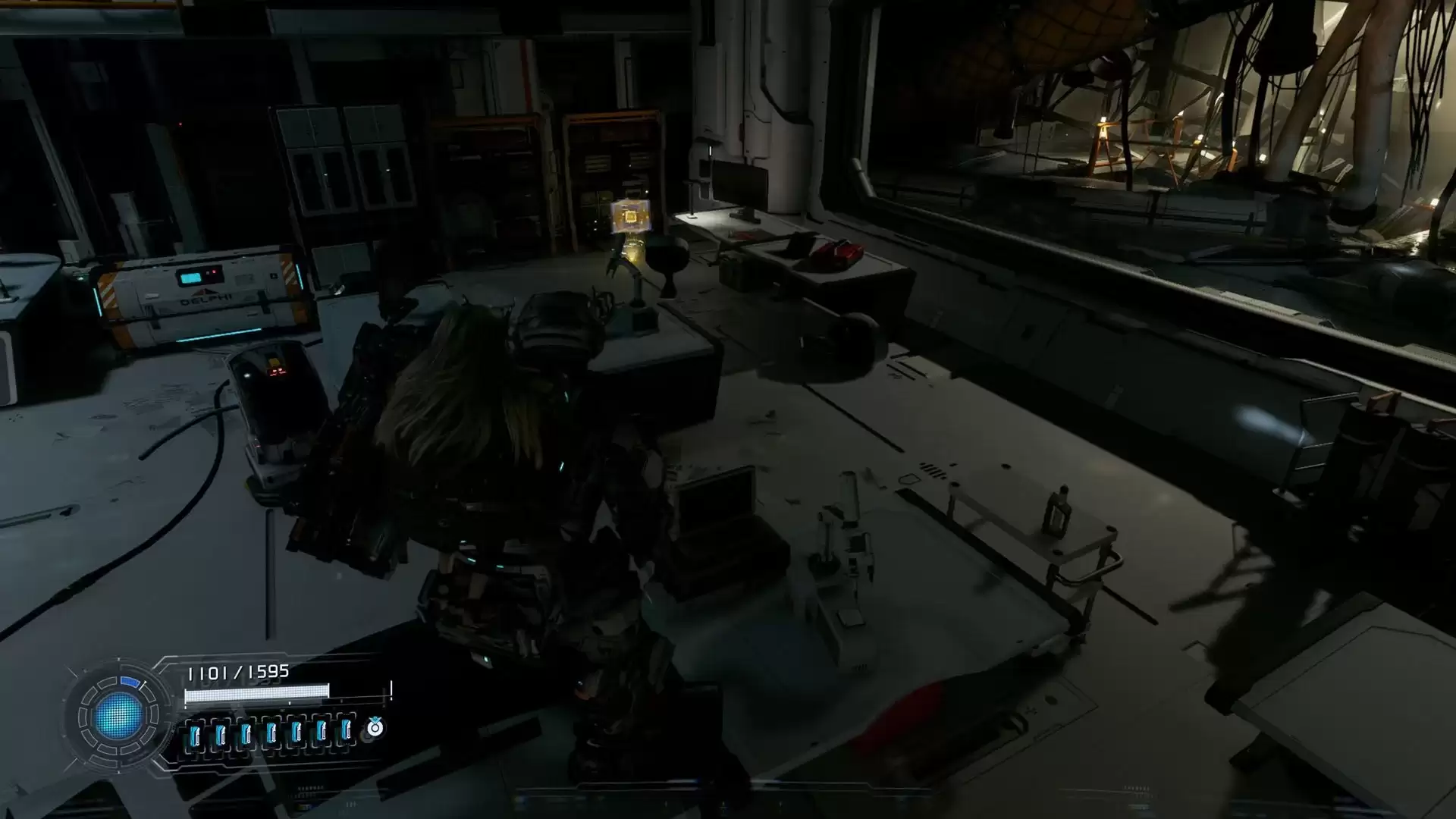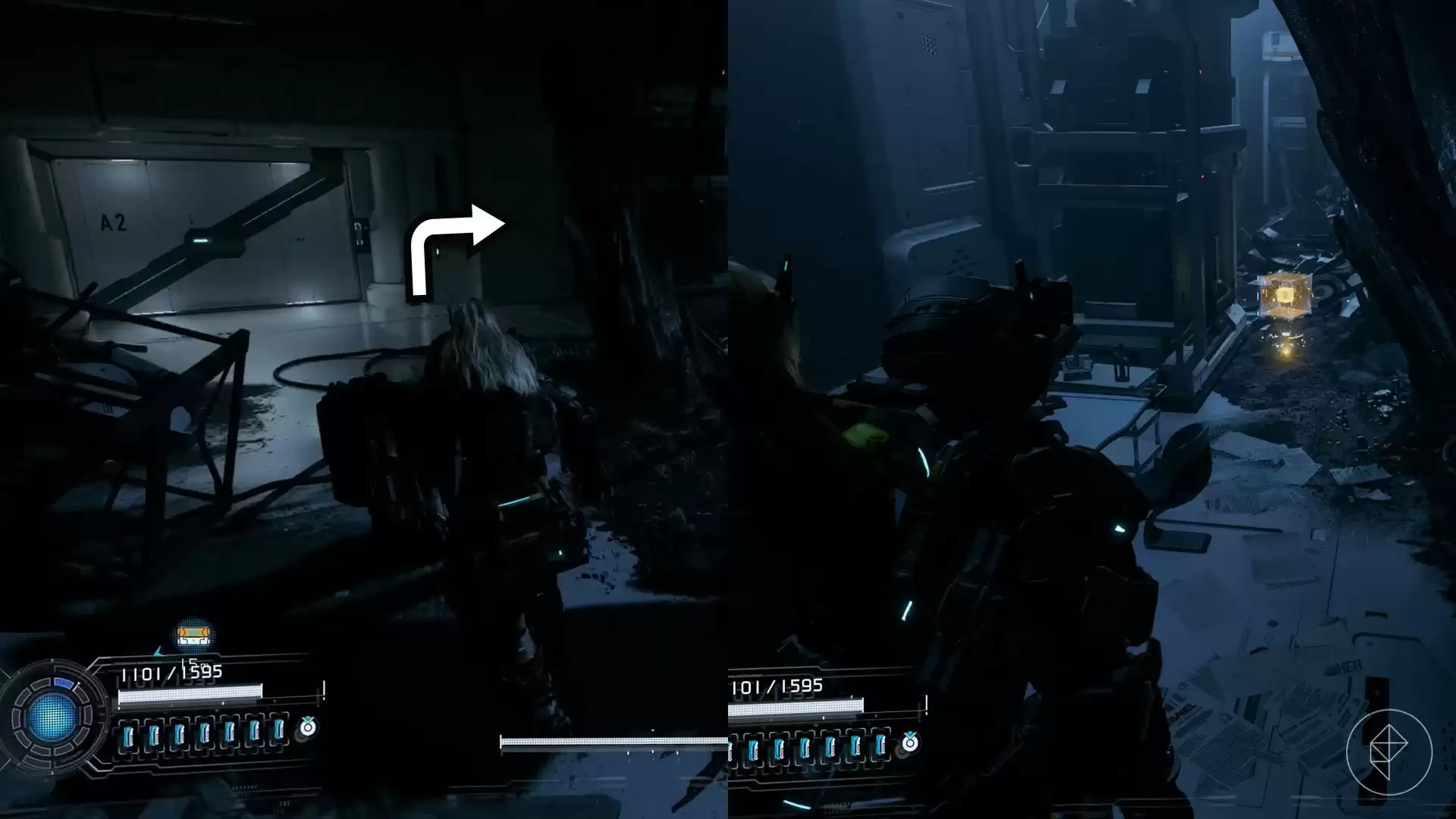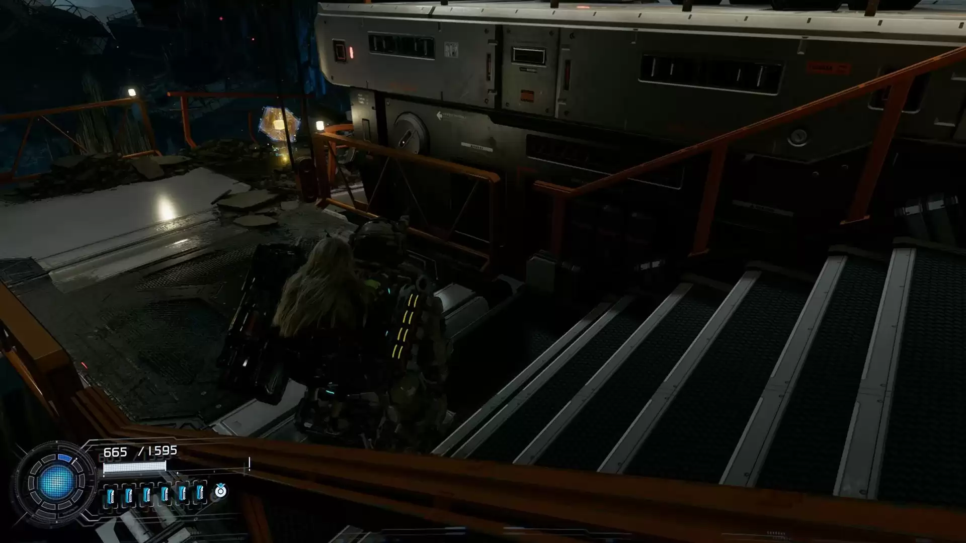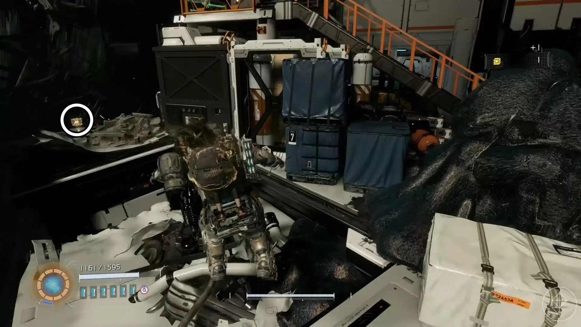 从货运站传送点出来,顺着楼梯往下走。在一个平台上,你就能发现第一个升级组件。