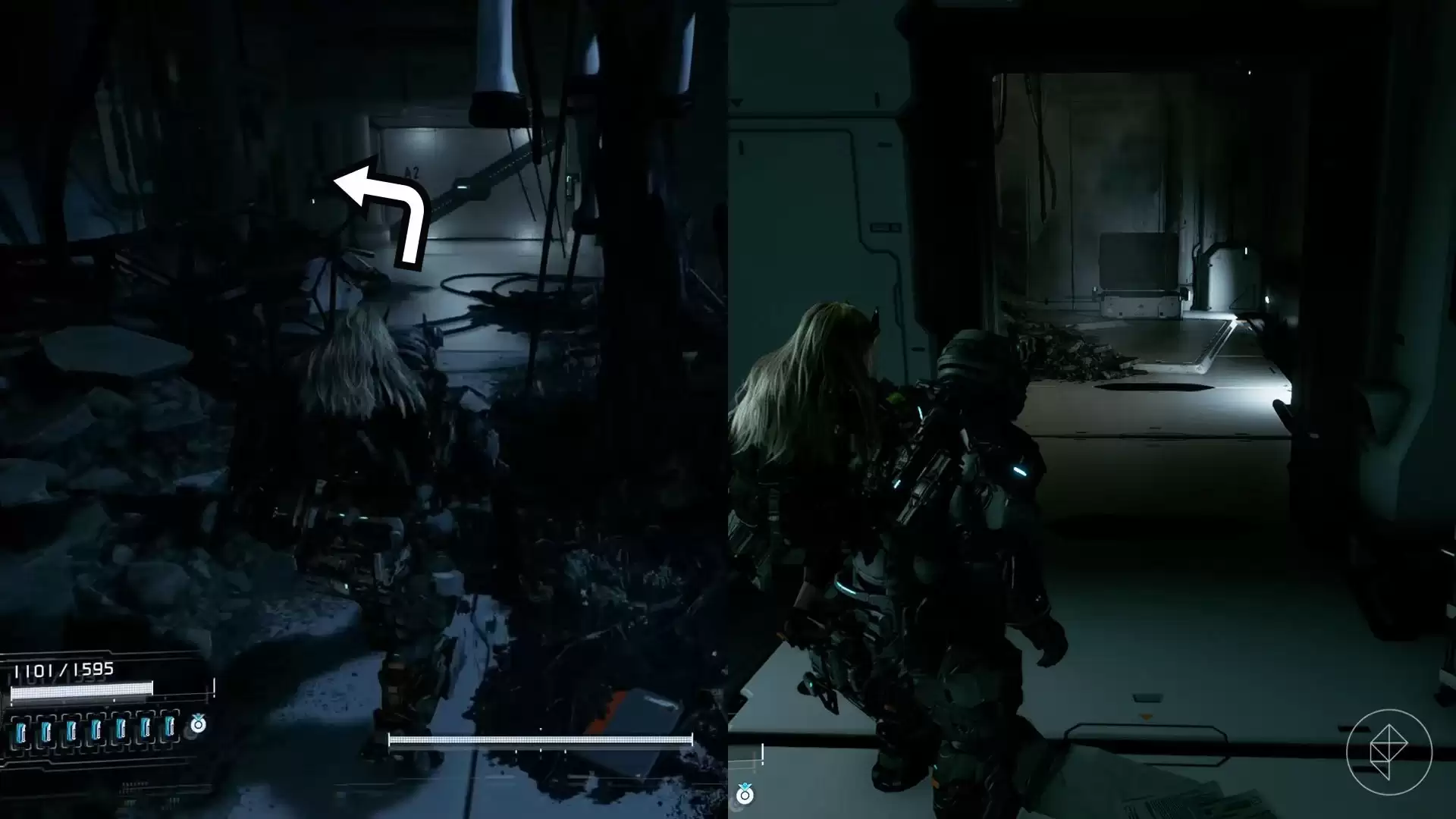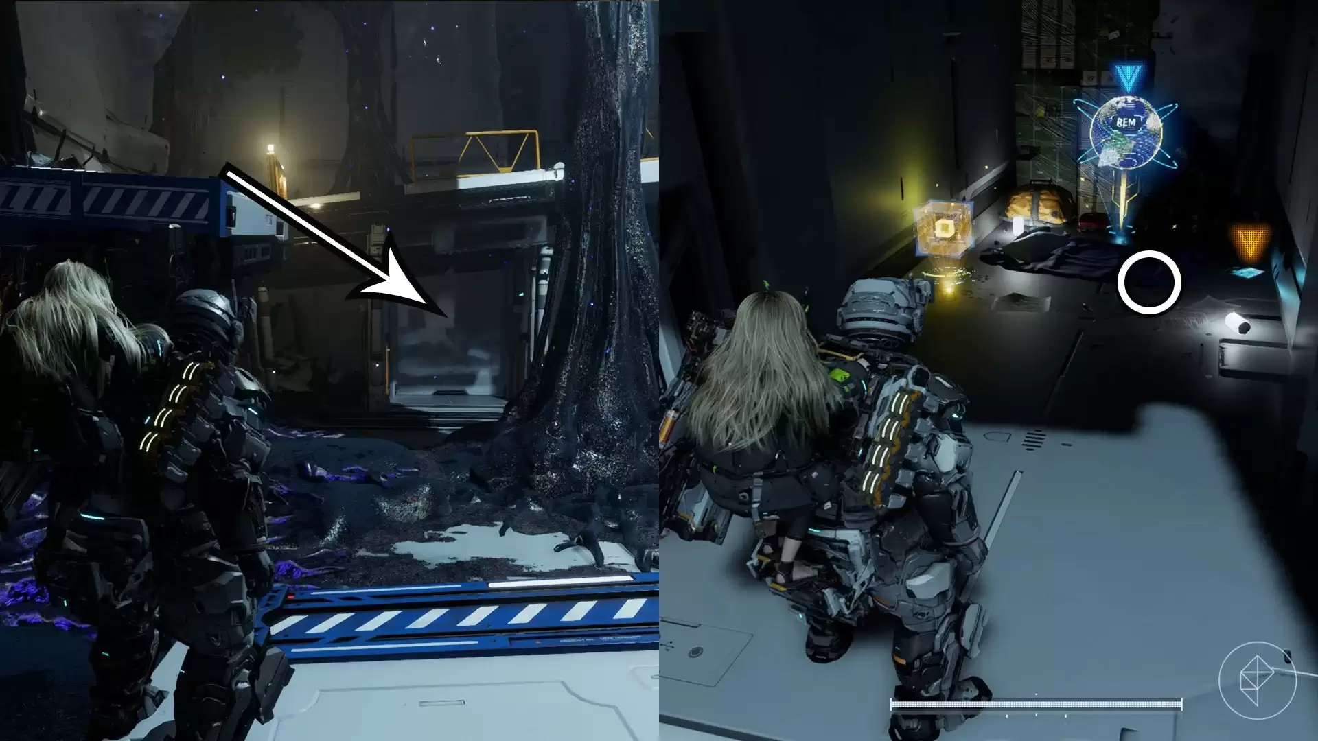 穿过红色区域后,会进入一个布满深色丝状物的巨大房间。你从上层平台的门进入,组件则在下层。关掉下层那面全息墙,后面不仅有一个升级组件,还有一个REM等着你。