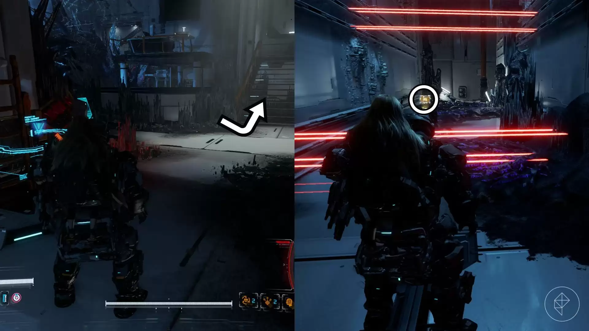 从研究区大厅的舱门出发,爬上右侧的楼梯。沿着路走进一条布满激光的走廊。别怕,走到走廊尽头,奖励就在眼前。
